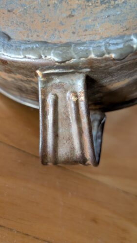 The workmanship tells its own story. The seams, visibly soldered by hand, are not hidden but accepted, even embraced. They speak of a tinsmith’s bench, of tools well-used, and of a craftsman more concerned with function than finish—yet unable to resist adding a slight flourish to the handle.