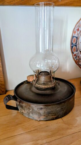 One can imagine it resting on a wooden table at dusk, its flame carefully tended. Perhaps it was carried by its looped handle from room to room, or set beside a bedside, its glow a quiet comfort at the close of day. The tin body, more durable than glass, suggests practicality—a lamp meant to endure.