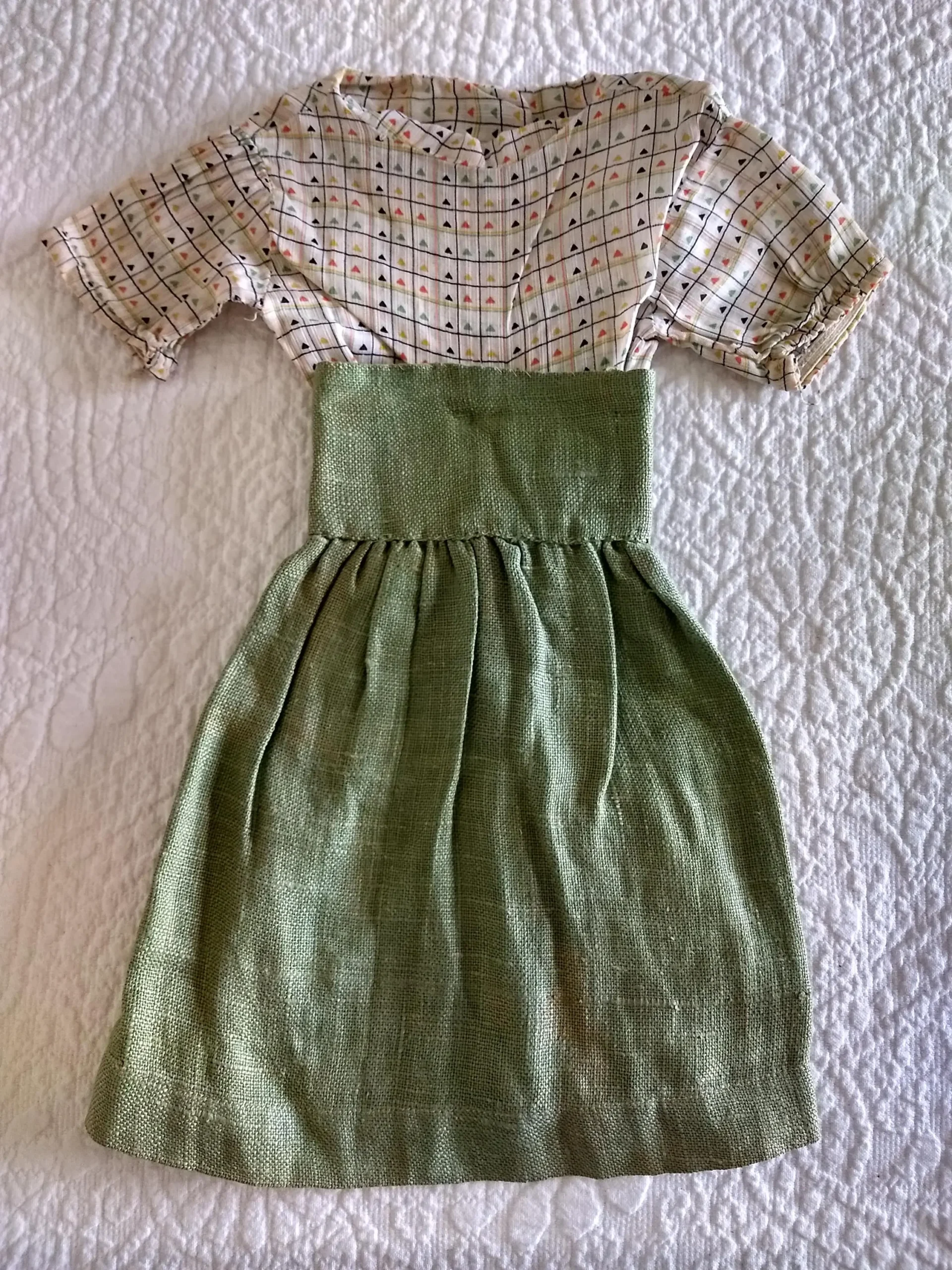 Vintage from the 1920’s or late teens, after WW1, a home sewn doll outfit in a green skirt and print blouse. The high waist skirt is made of a green cotton in a crash fabric. The little blouse is in a slightly sheer cotton fabric of a colorful print.