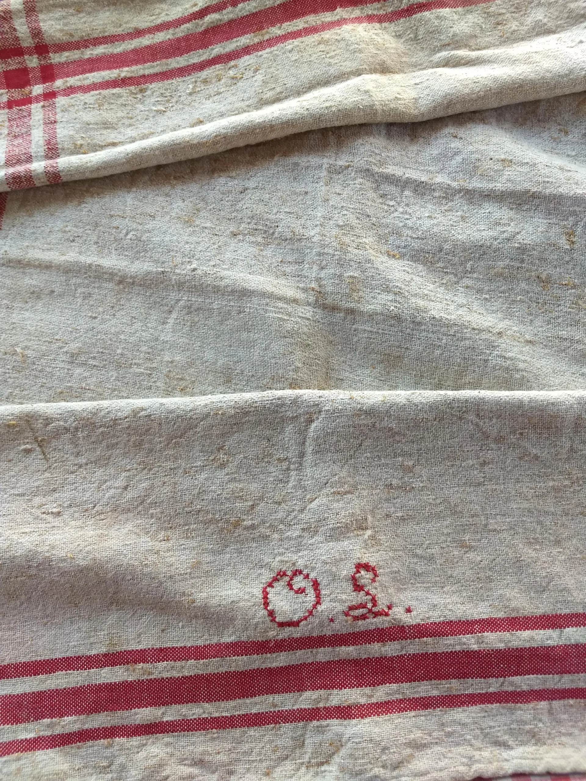 At the top center a piece of braid is sewn to make a tab to hang the towel on a peg or nail. At the bottom embroidered initials of O L in cross stitch.