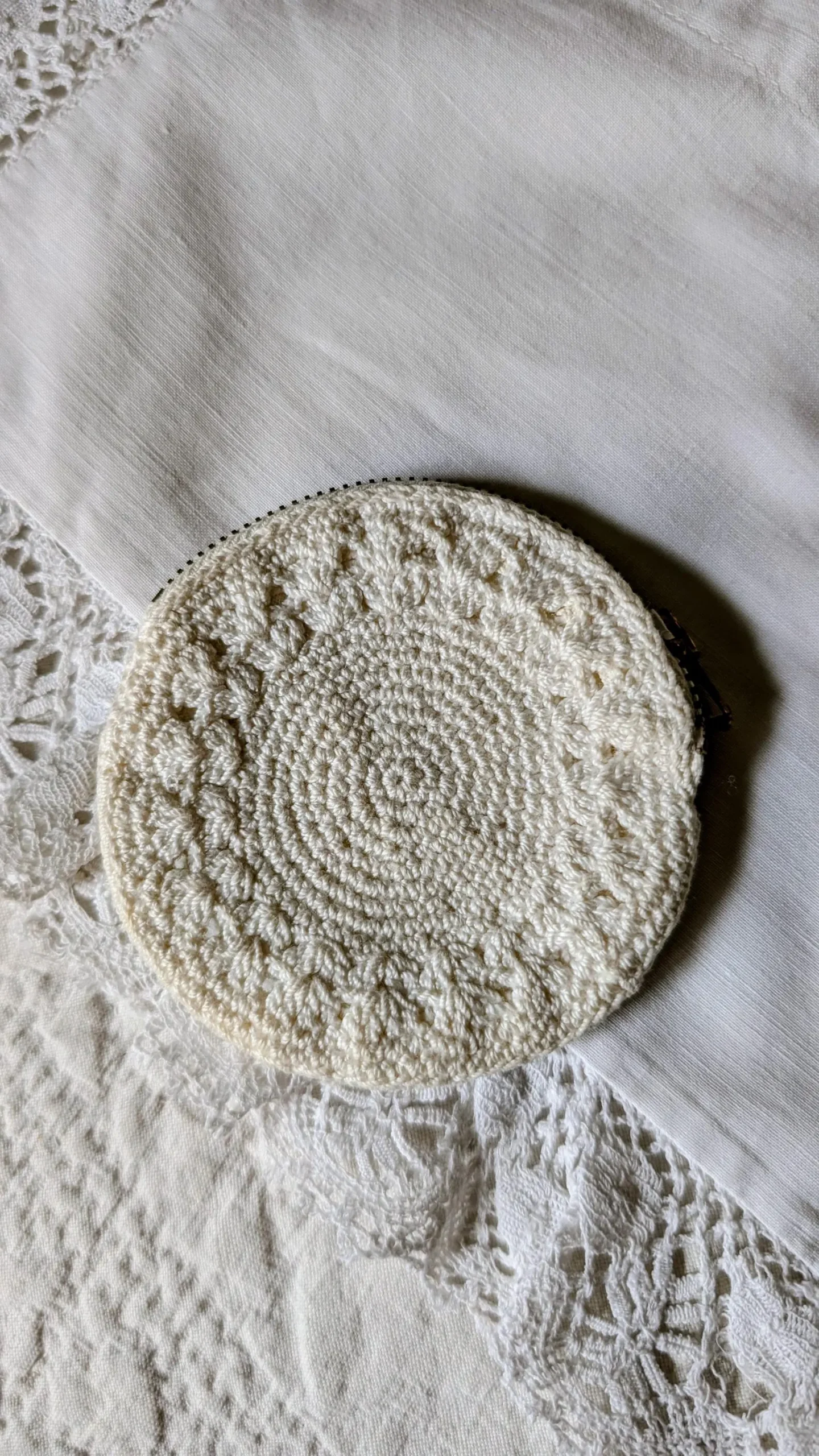 From the war years of the 1940’s, a sweet white crochet coin purse in a round shape with zipper closure