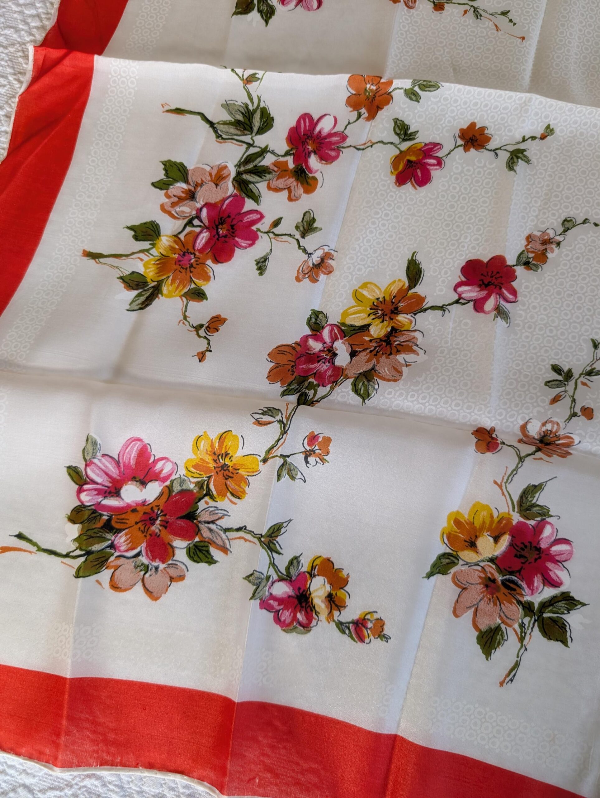 From the vintage years of the 1950’s, perhaps even the 1940’s, a rayon silk neck or head scarf in a lovely floral design. The hand rolled hem scarf with it cluster of flora bouquets dominates almost the entire 30″ x 31″ fabric. Colors are pink red, golden and green. Wider solid red border.
