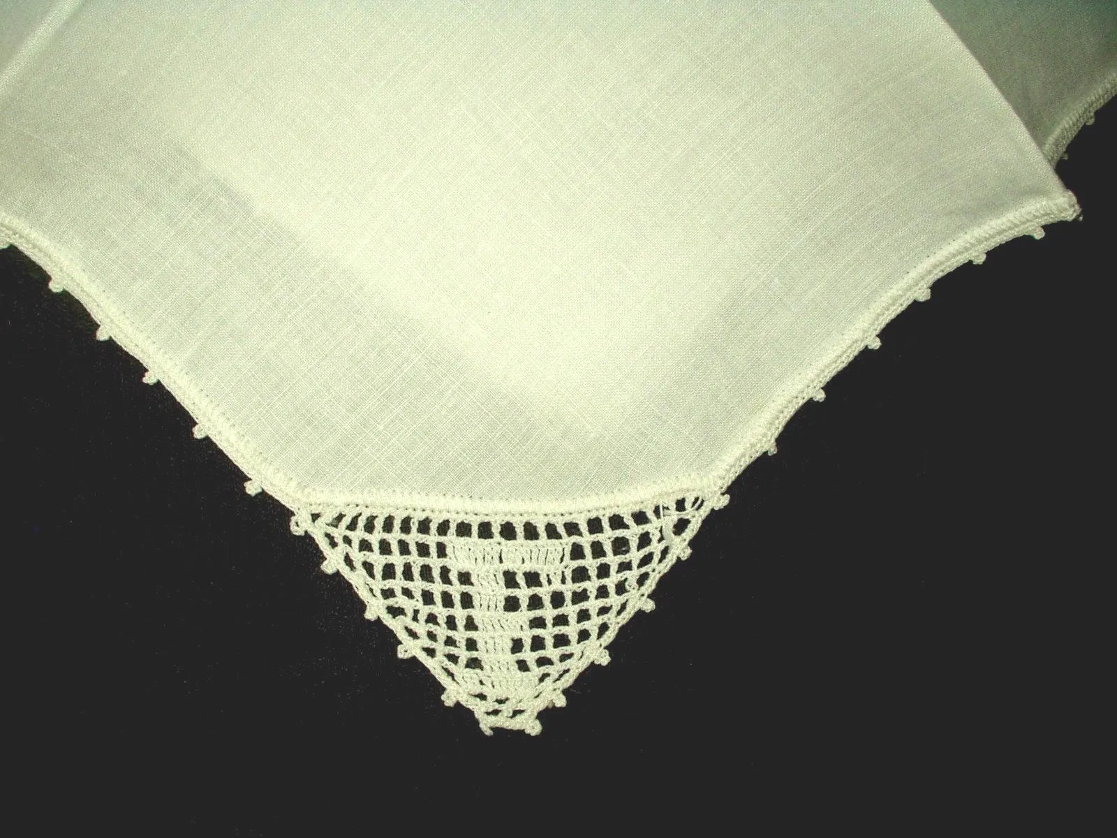 A lovely set of 9 vintage 1930’s – 1950’s hand crochet edge linen luncheon napkins. On each of the napkins one corner has been cut away, then filled with filet crochet stitches with a monogram of the letter “F”.