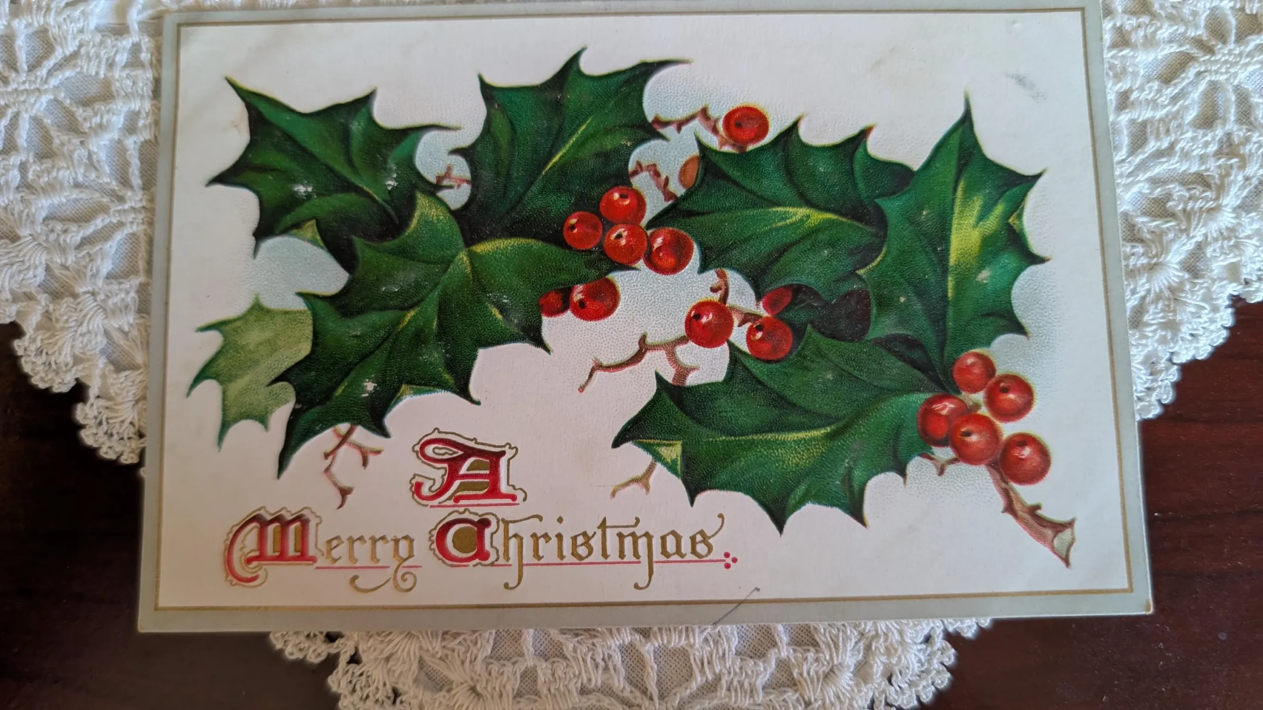 A Raphael Tuck postcard from the early 1900’s. The die cut greeting features clusters of holly berries on the front. To and from name on the back. The embossed card is printed with Ralphael Tuck & Sons HOLLY LEAVES AND BERRIES. Series of Christmas postcards No 500. Mailed to Bowen, Ill.