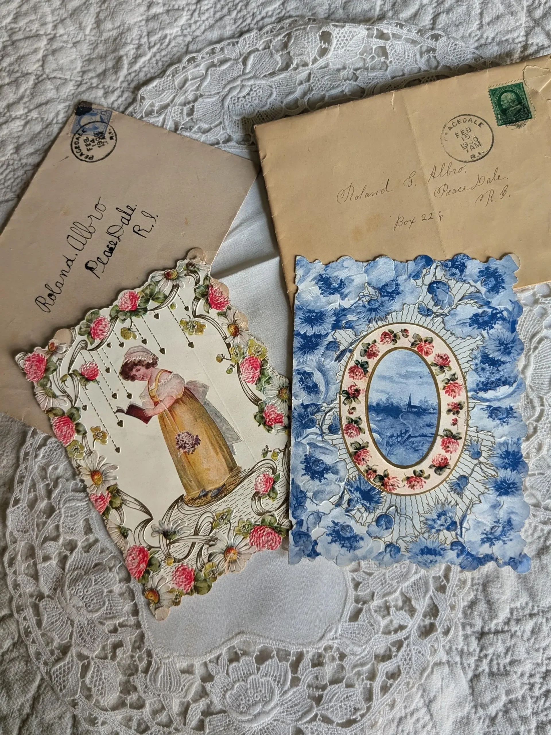The valentines themselves are typical of the period: delicately printed, softly colored, and meant to charm rather than astonish. One features a youthful figure framed by florals, the other a romantic oval vignette surrounded by blue blossoms—pleasant, familiar designs that would have been affordable and widely available at the turn of the century.