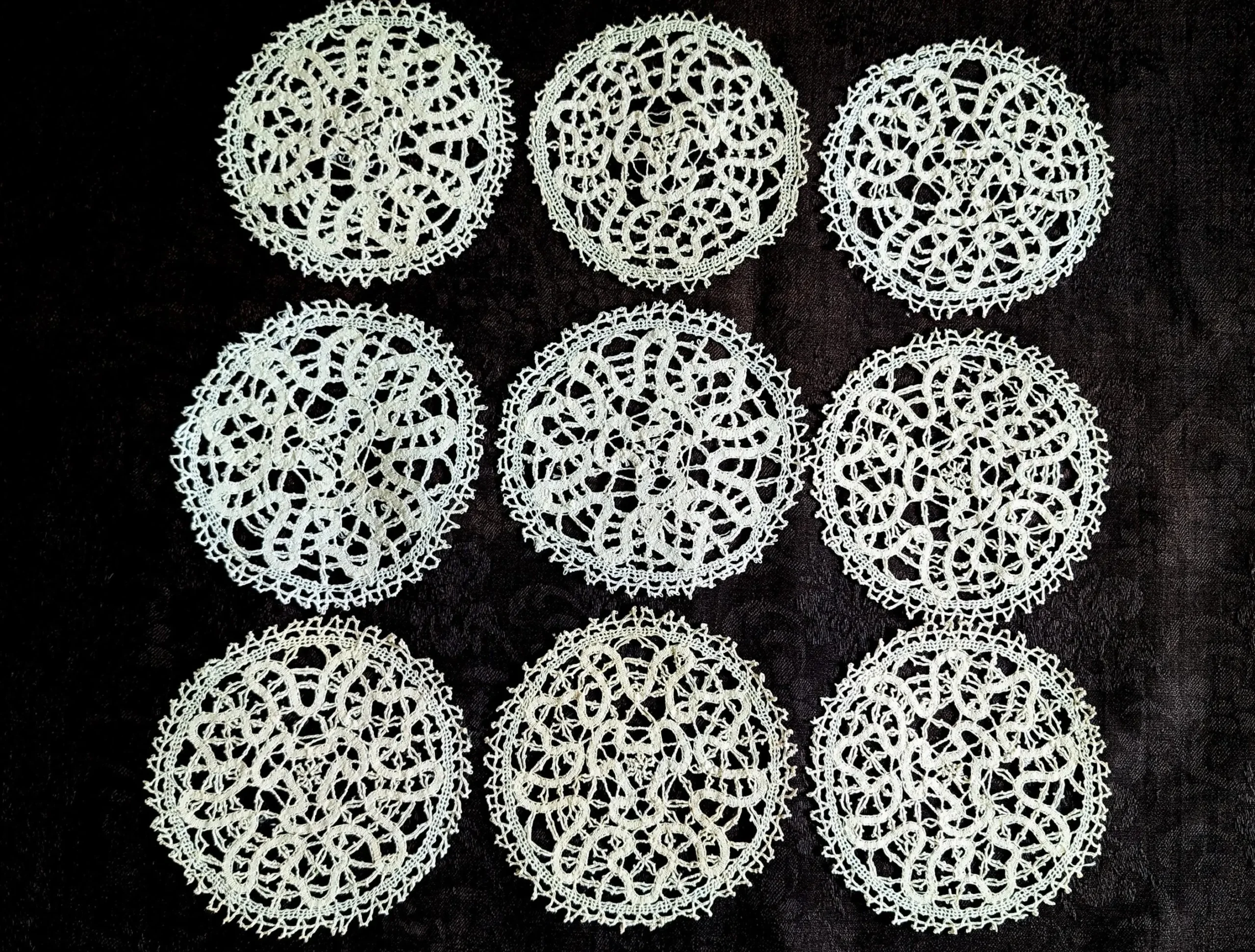 Nine Edwardian or 1920’s hand made Cantu Bobbin lace table doilies in an off white cotton or linen thread. A pretty pattern with a pleasing edge. All are in good condition, possibly even being unused.
