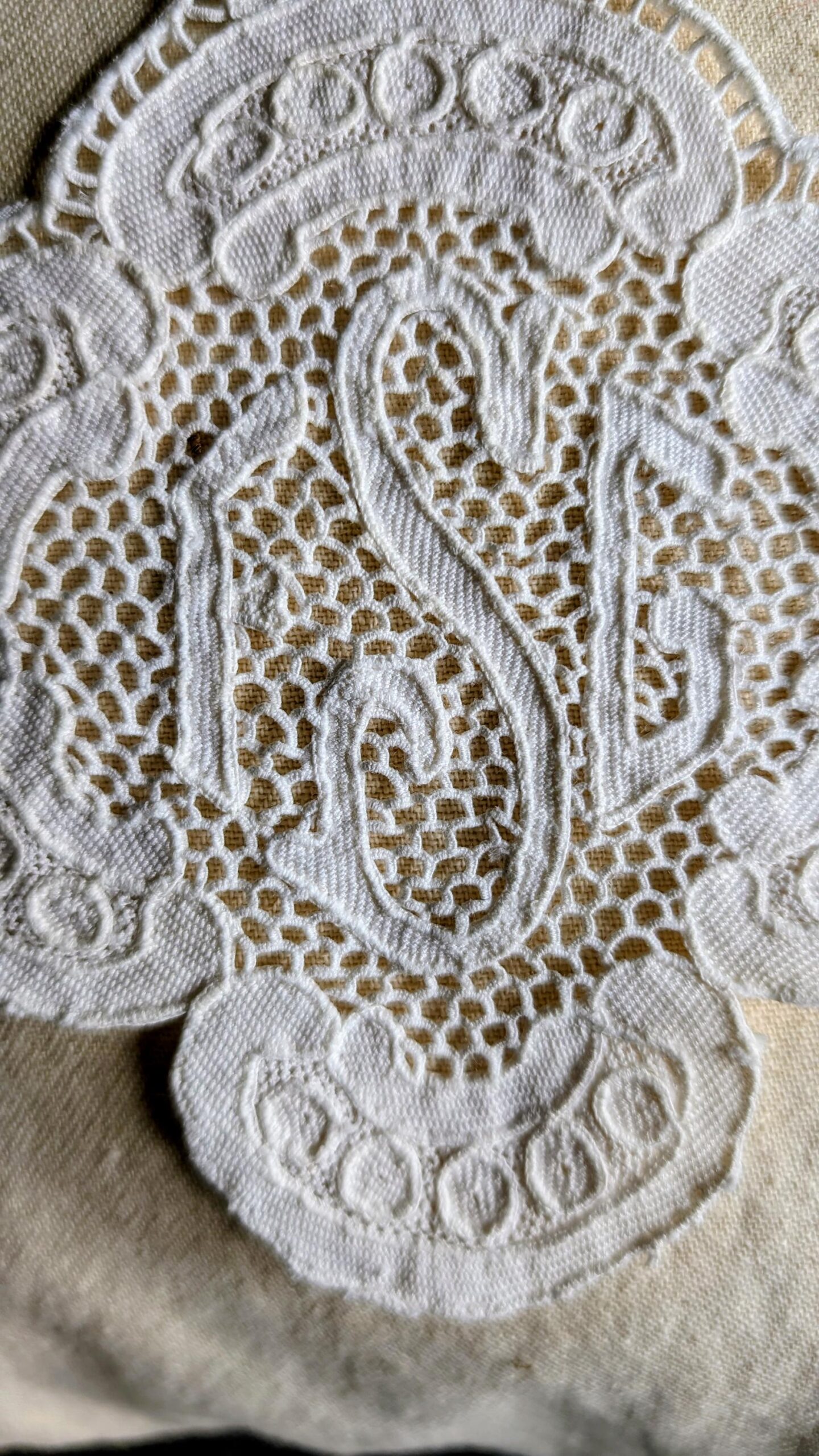 ✧ The buttonhole-style edging around the outer shape shows small, individually worked stitches rather than the perfectly identical bites a machine would produce.
