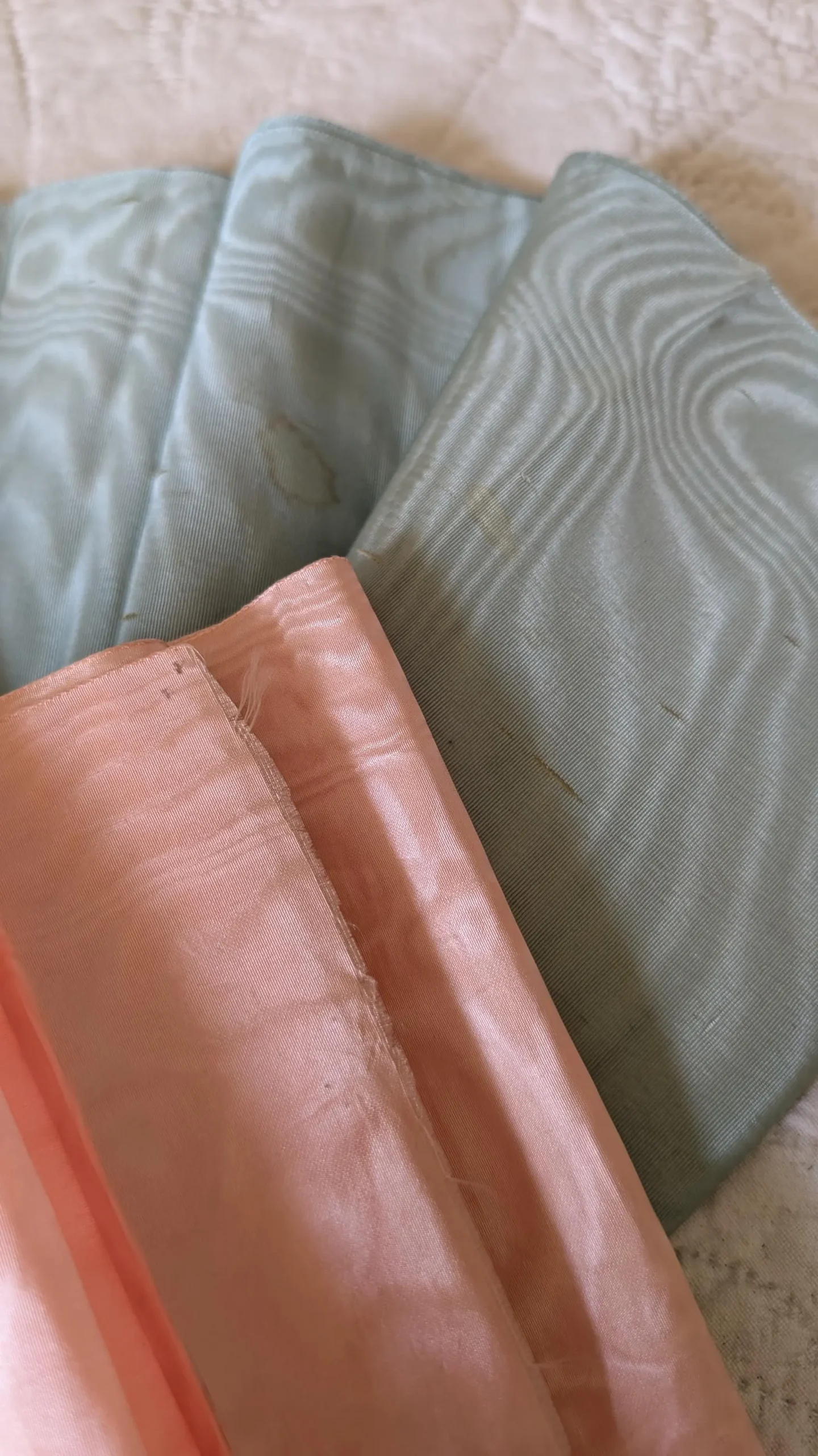 Offered here are two beautiful examples of **early 20th century silk moiré taffeta ribbon**, dating to the Edwardian era. These wide ribbons were likely intended for **millinery trimming, sash work, or decorative garment embellishment**, where their elegant watered silk pattern would catch the light with subtle movement.