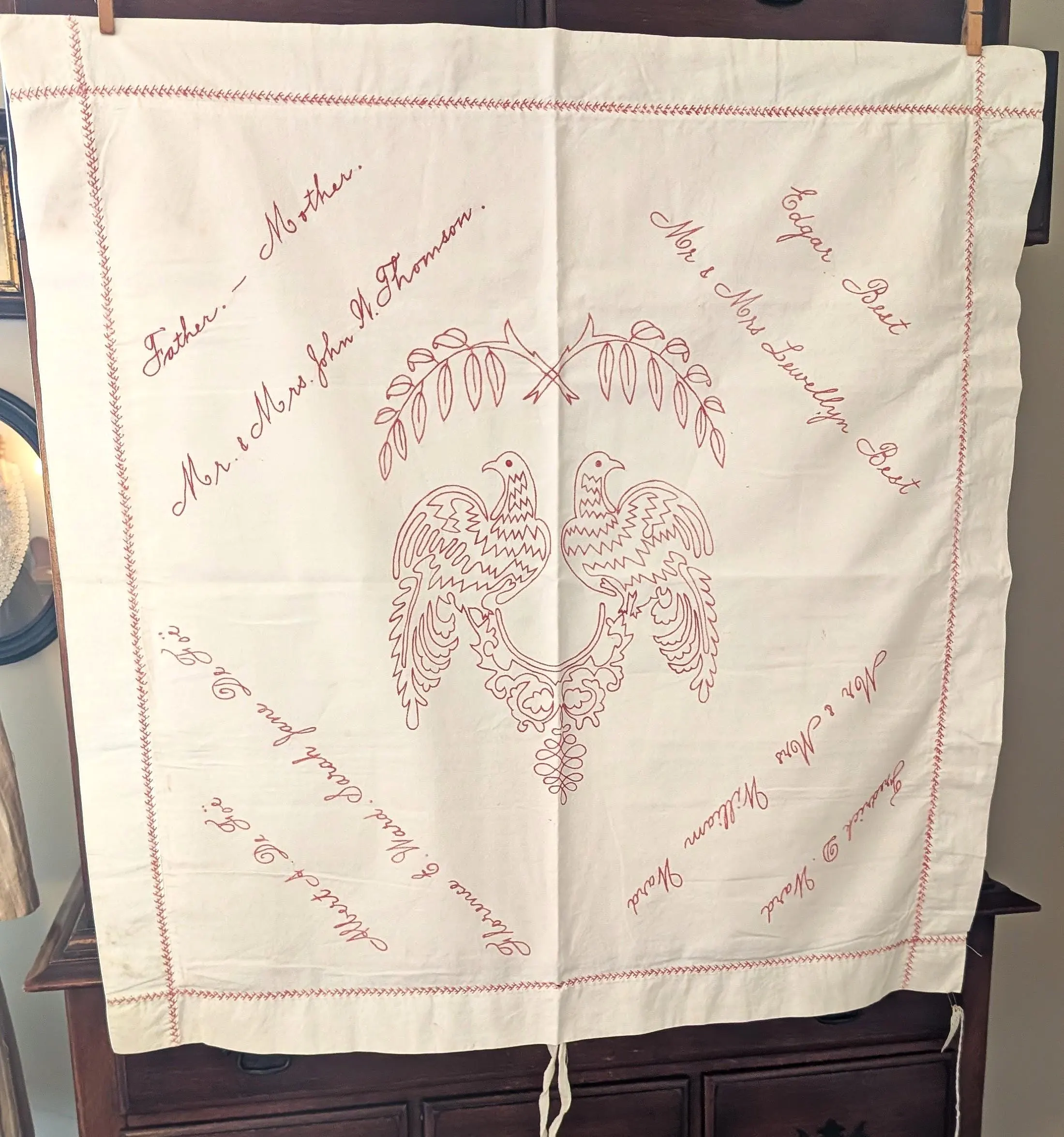 This is a wonderful example of American redwork at the height of its popularity—both decorative and deeply personal. Ideal for collectors of Victorian textiles, redwork embroidery, or meaningful wedding and friendship keepsakes.