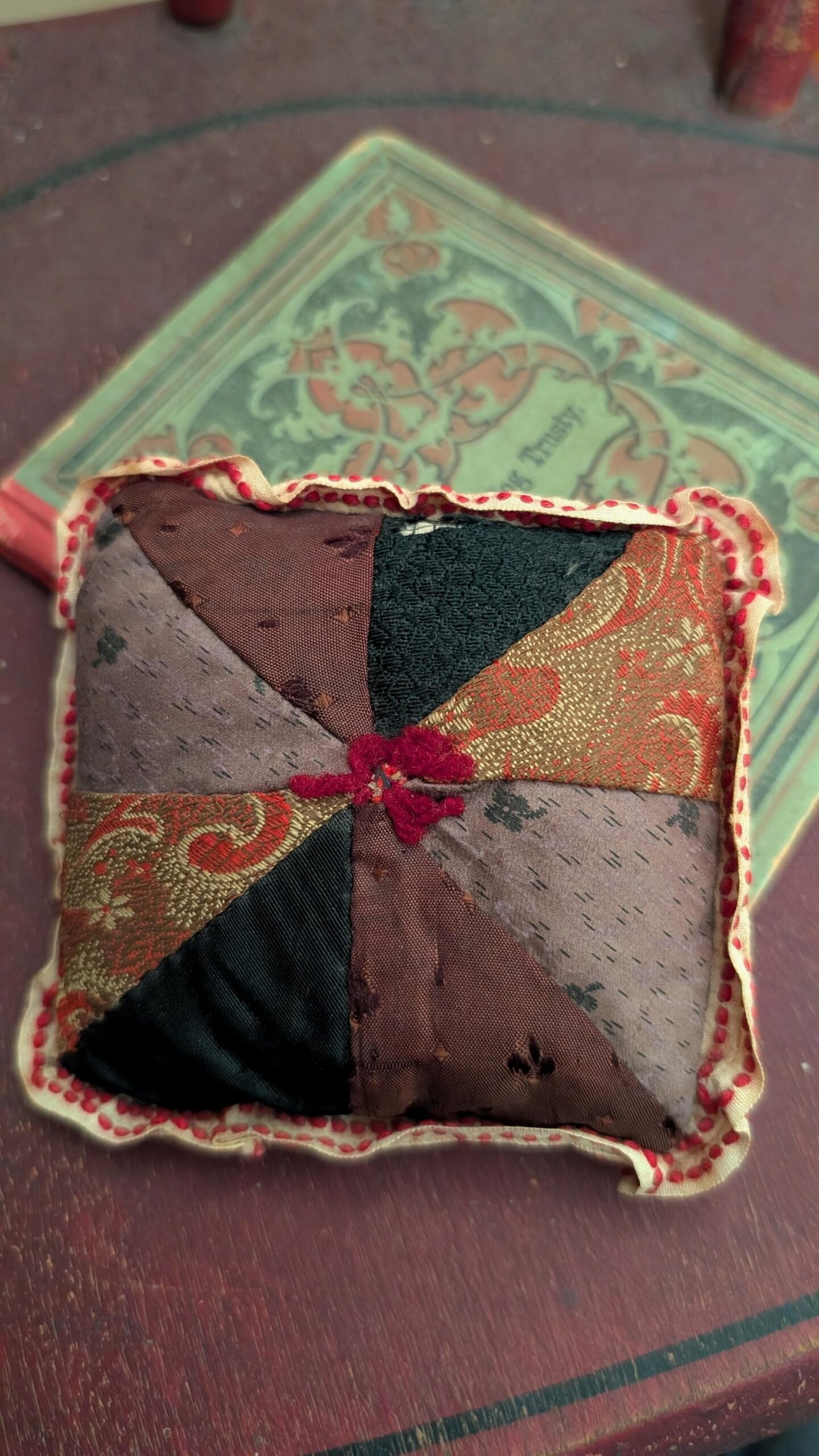 Home » Vintage Sewing Tools » Antique Victorian Edwardian Silk Brocade Sewing Pin Cushion