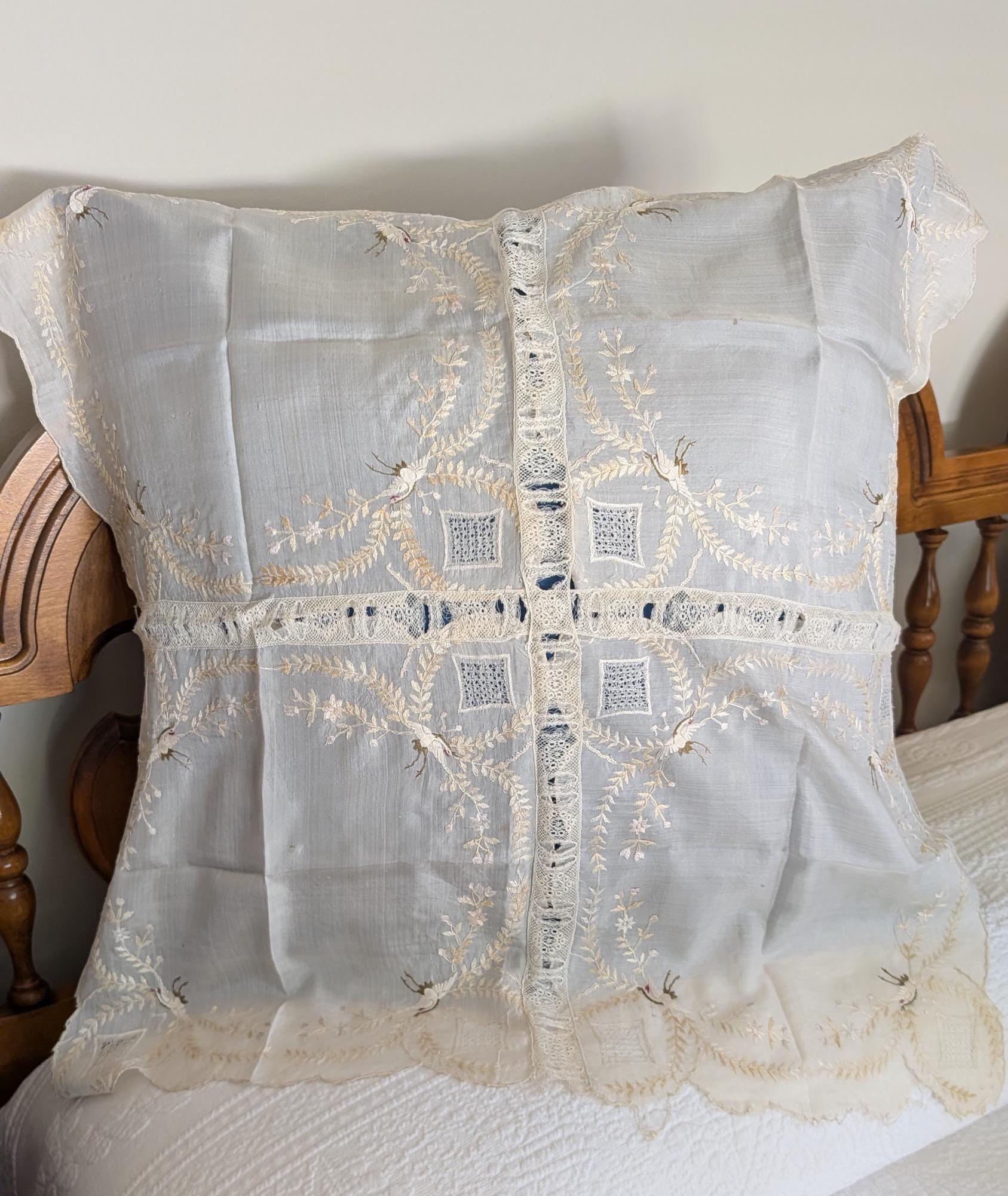 The Gatherings is offering this topper for either a pillow or table in a pleasing design. It is made from 4 silk handkerchiefs, seamed together with insertion lace for threading a ribbon through. Embroidered cranes and plumes of leaves set this theme in motion. At different locations. a square of drawnwork is also incorporated.