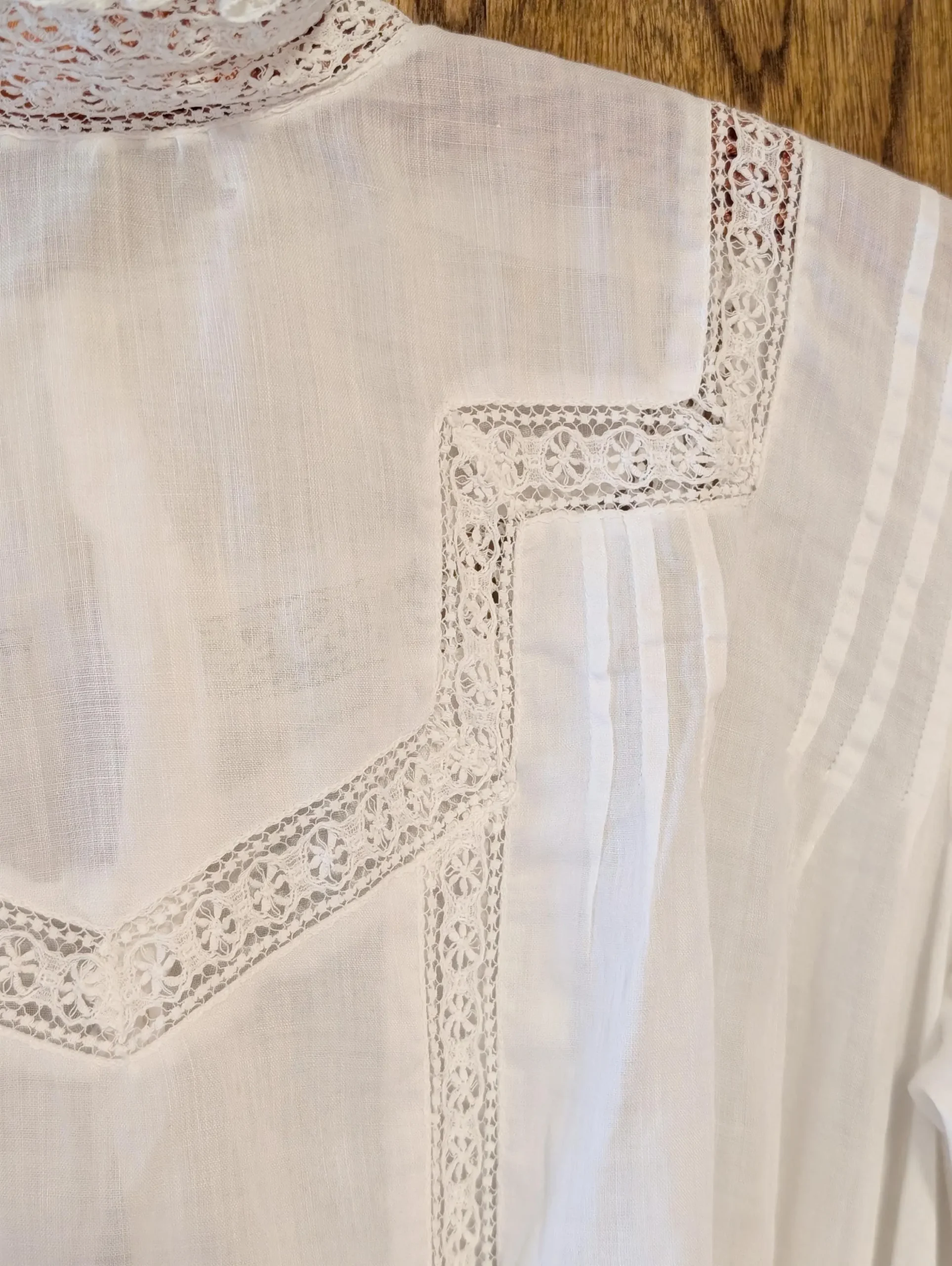 The long dress is made with a high neck collar of lace. This same lace is used as insets defining a pretty shape to the bodice. There are three tucks on either side of the shoulders of the bodice. Sleeves are full with lace at the wrist. The waist band is made of lace except for the fabric panel on the very front. The skirt is made of tucks over the hip area for a more sleek shape to the full skirt. Wide full ruffle at the bottom with three wide tucks circling the ruffle.