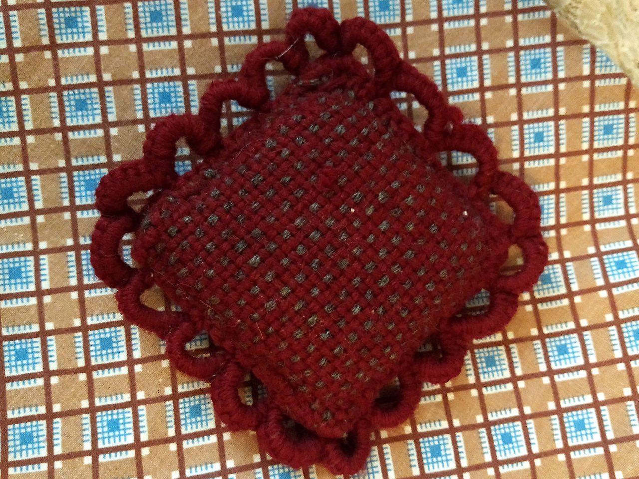 Pincushion is hand loom woven of wool yarn in a burgundy or maroon and gray thread.