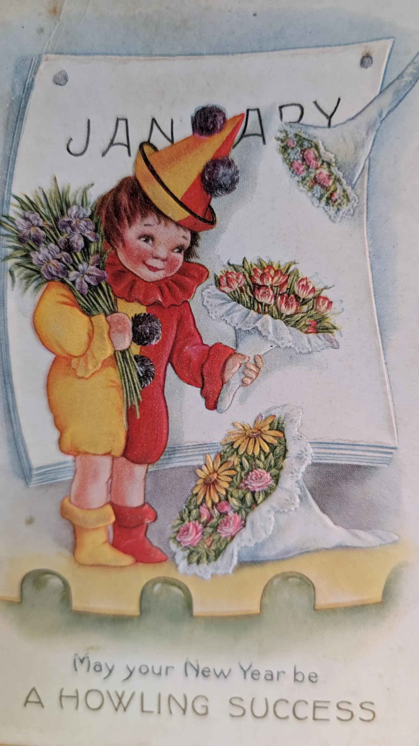 An old vintage die cut postcard from the early 1900’s. This colorful card features a child in a clown suit, welcoming in the new year. A written message on the back extends greeting to Raymond and Erwin from Gordon.
