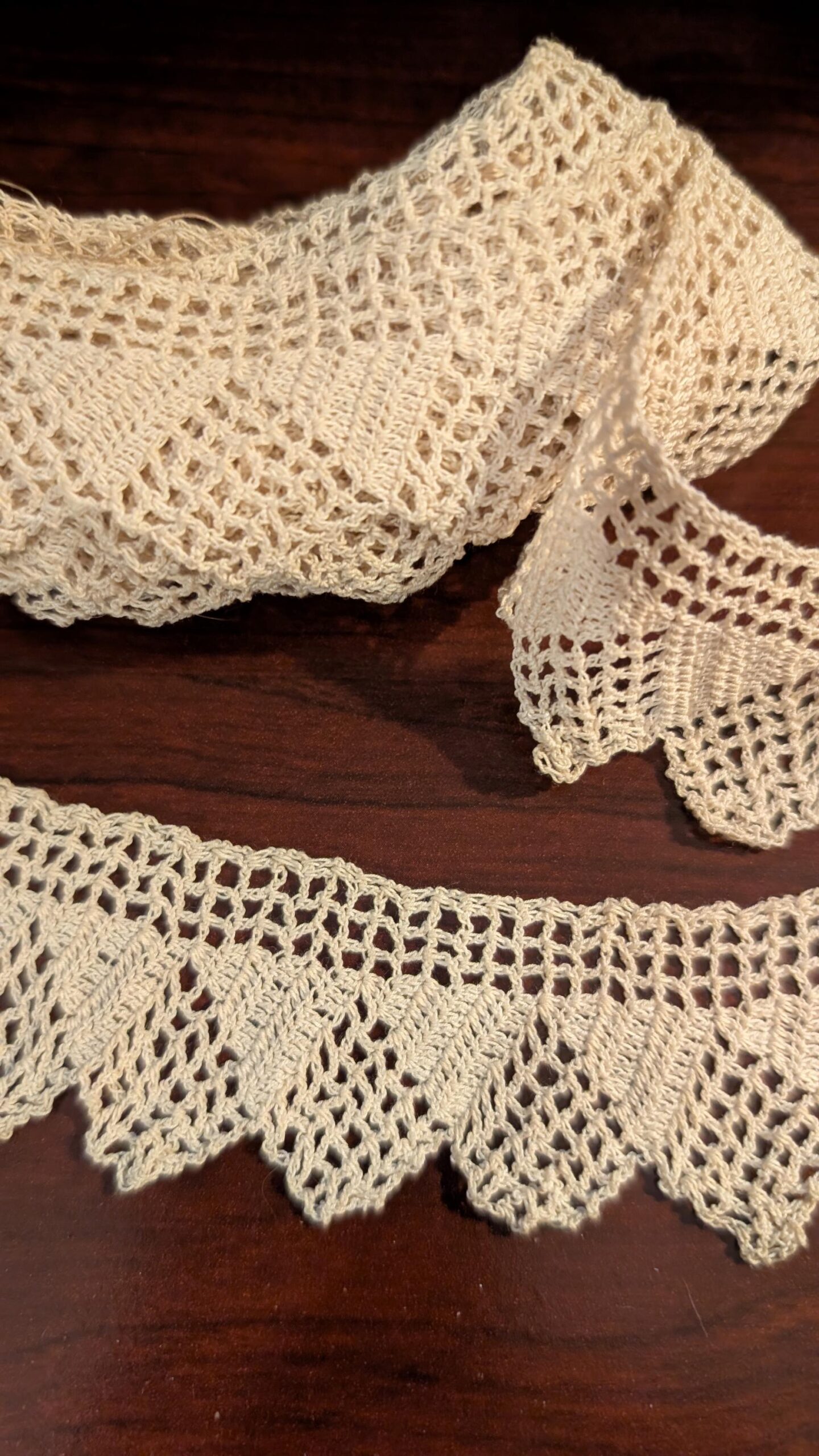 A nice hand knitted trim dating from the early 1900’s. The trim measures 3 yards 27″ long x 1-1/4″ wide to the point of the scallop.