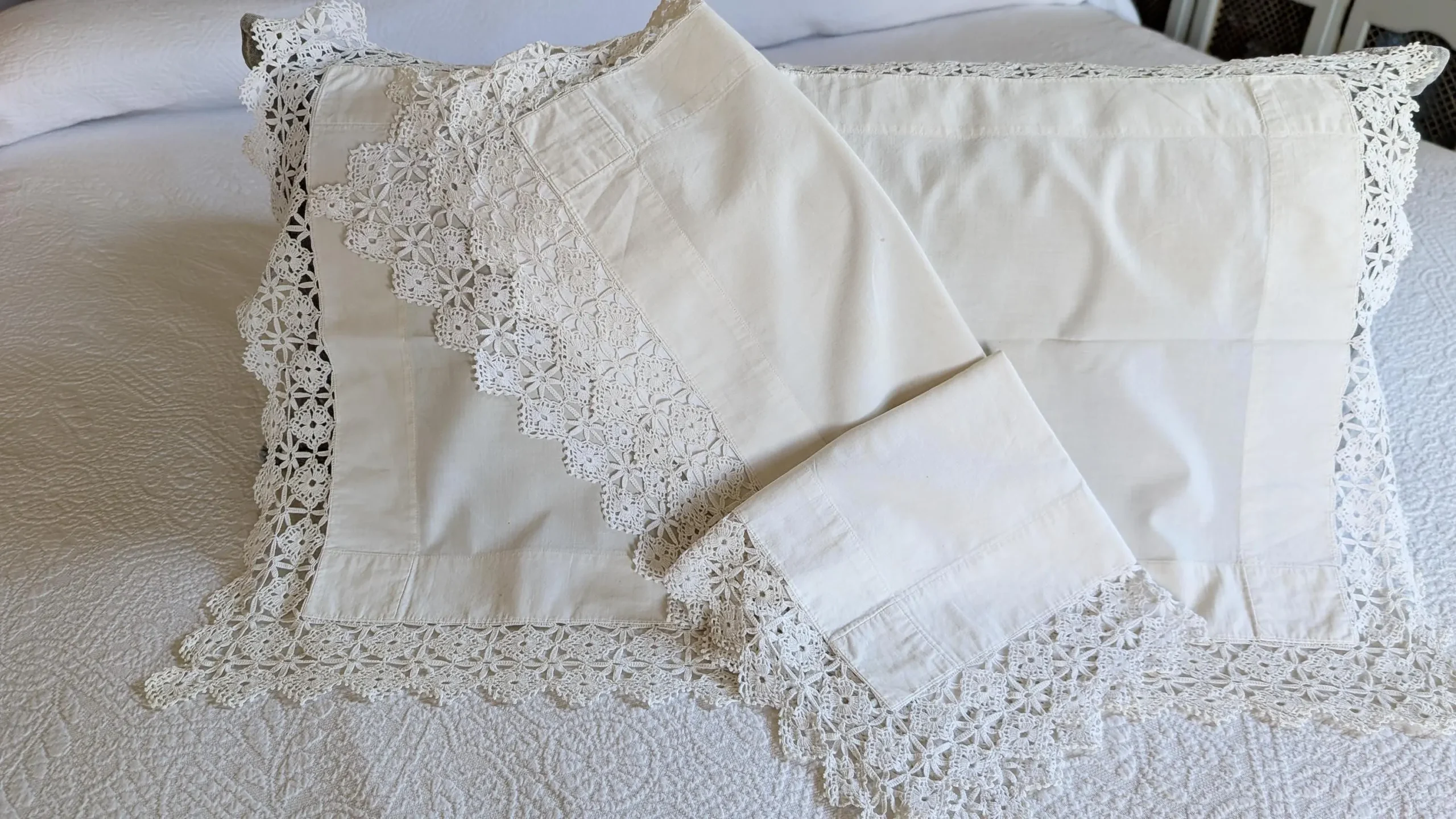 A late Victorian pair of white cotton oblong topper pillow shams. The pretty bedding dates from the Victorian – early 1900’s era. The layover shams are edged with a beautiful hand crochet trim around the four sides. The edging is 3″ wide.