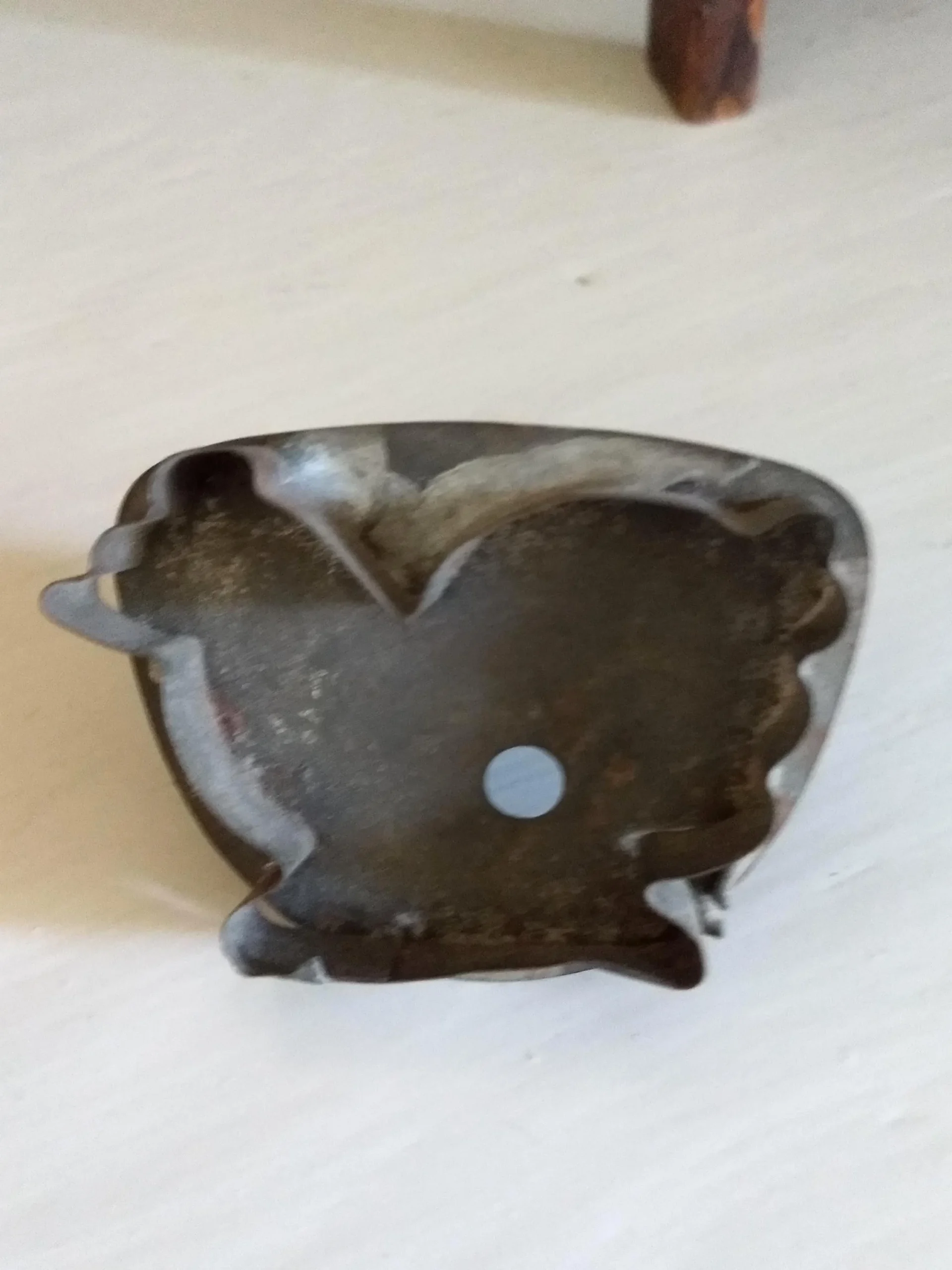 A primitive tin cookie cutter in the shape of a chicken hen fowl. Nice piece of old kitchenware. Dating from the early 1900’s, the cutter features a cut out hen, strap handle and soldering on either side of the handle.