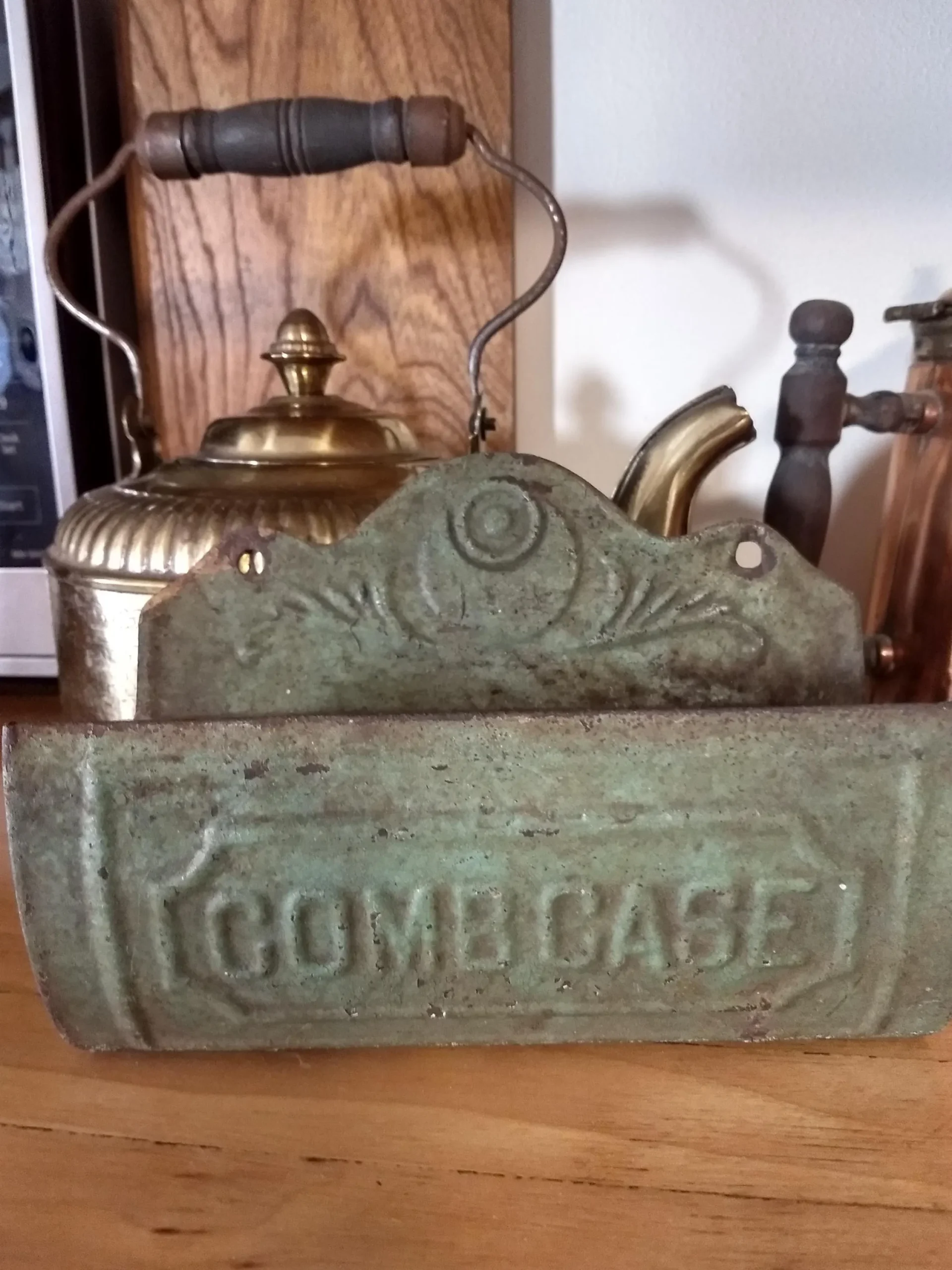 A wonderful old wall hanging tin comb case in original green paint from the early 1900’s. Embossed lettering on the front of case with frond leaf design at the top.
