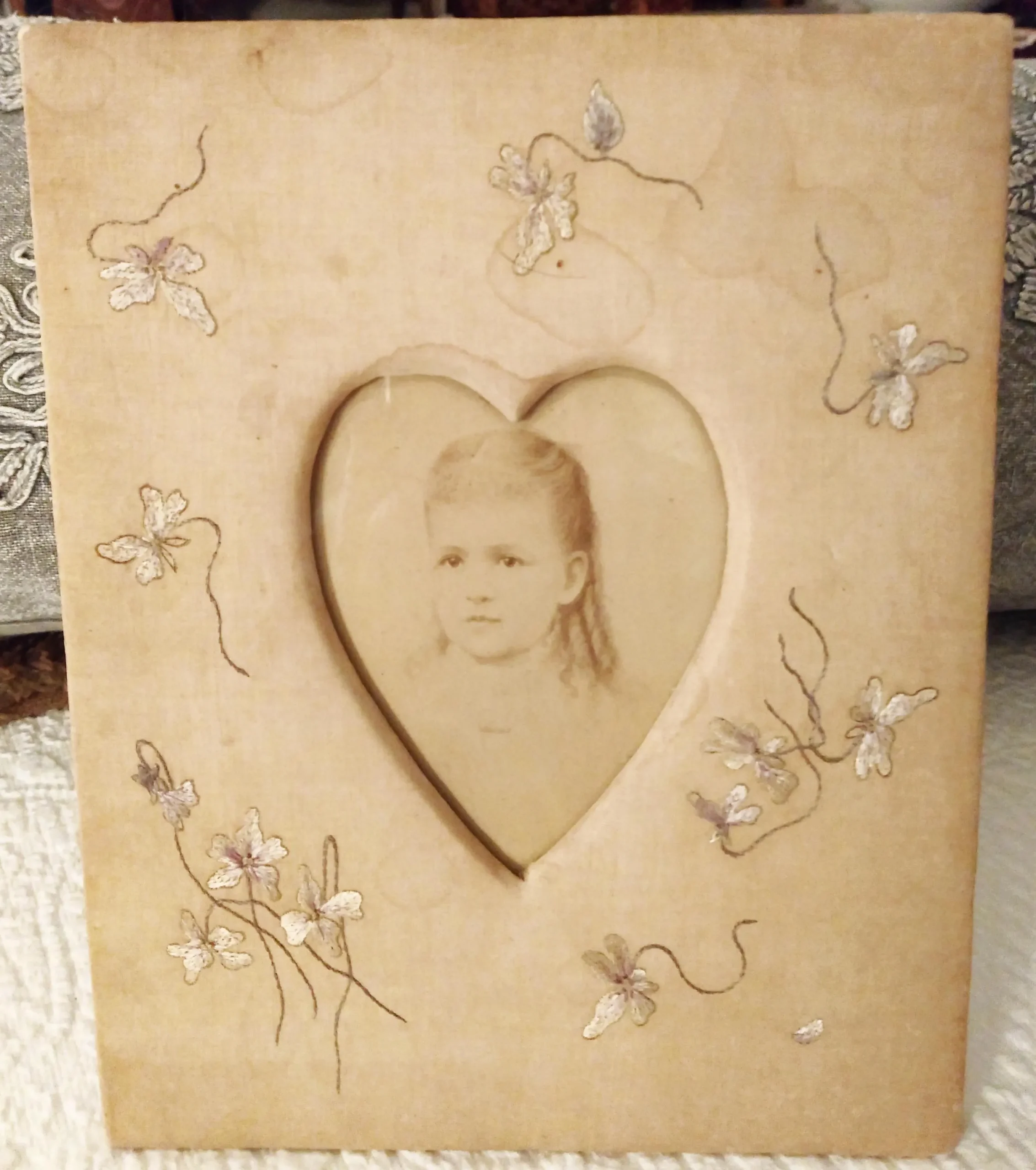 This particular cloth frame is embroidered with a scattering of violets surrounding the heart shaped opening. A photo of a sweet girl is centered in the heart opening. Glass covers the photo.