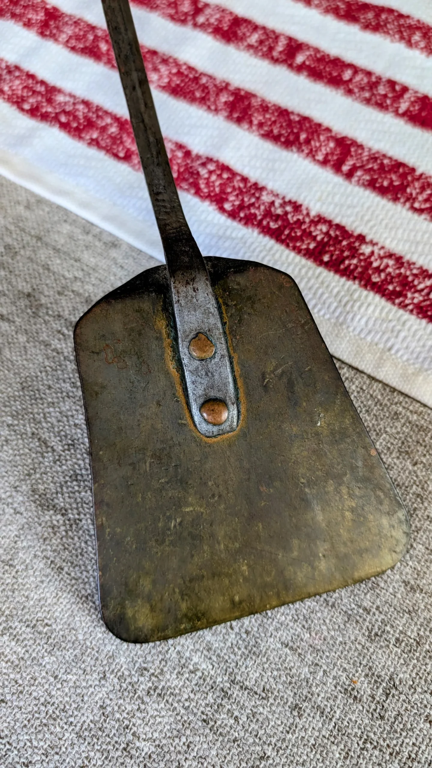 The Gatherings Antique Vintage is offering a 19th century brass and iron oven peel in a graceful flared shape. Handle is iron and I believe hand wrought. Hole in the end of handle for hanging. The handle is attached to the back of the peel with two copper rivets.