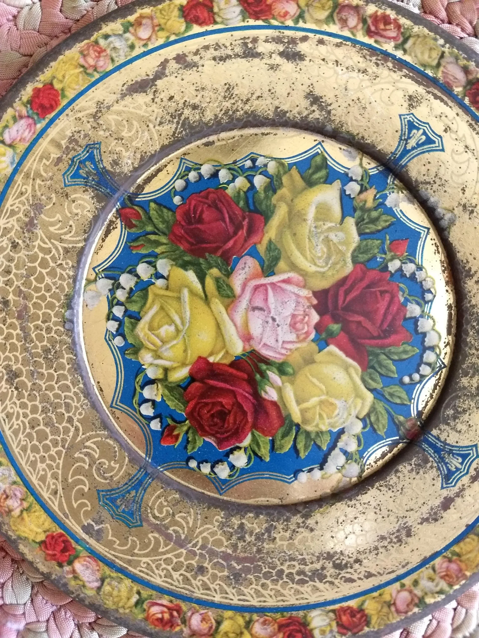 From a child’s pretend play set, a 6-3/8″ diameter litho tin plate. Dating from the Art Nouveau era, the center of the plate features roses and lily of the valley flowers.