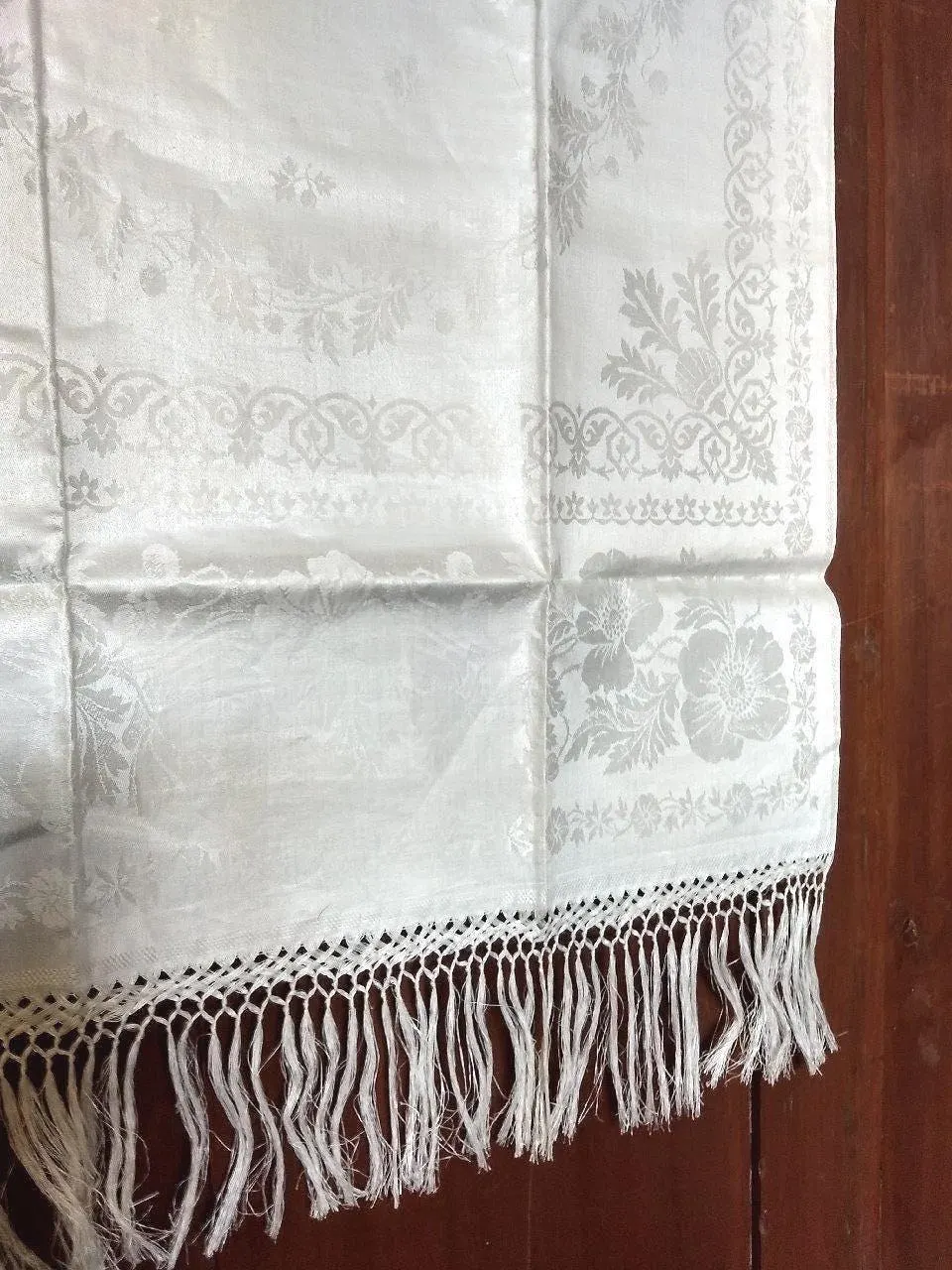 Gorgeous, Victorian 1880’s to 1900’s, white linen damask towel with lovely poppy flower decoration. The two end of towel are fringed with hand tied fringe. The motif features a circular garland of budding poppies with leaves at the center. An inner, as well as outer border, features more blooming poppies and scroll designs. Truly a beautiful study of poppies. Truly a beautiful towel.