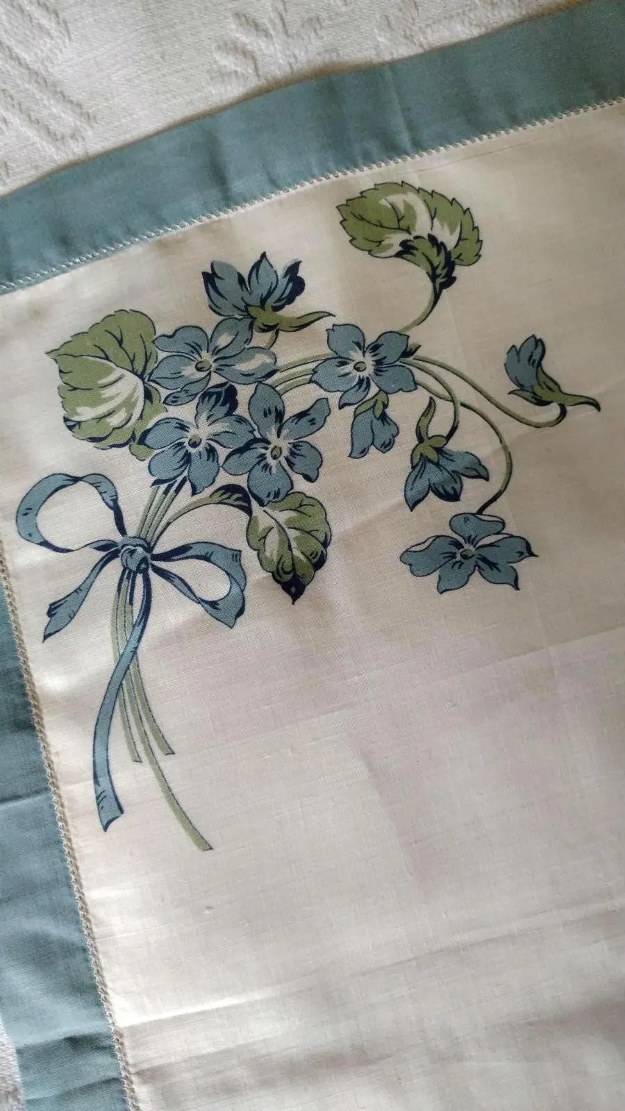 Tied bouquet of flower appear in each of the four corners of this lovely late Victorian or Edwardian cotton handkerchief, hankie. Made in a cotton fabric, the blue flowers are printed on a white background. Border color is the same blue as the flowers.