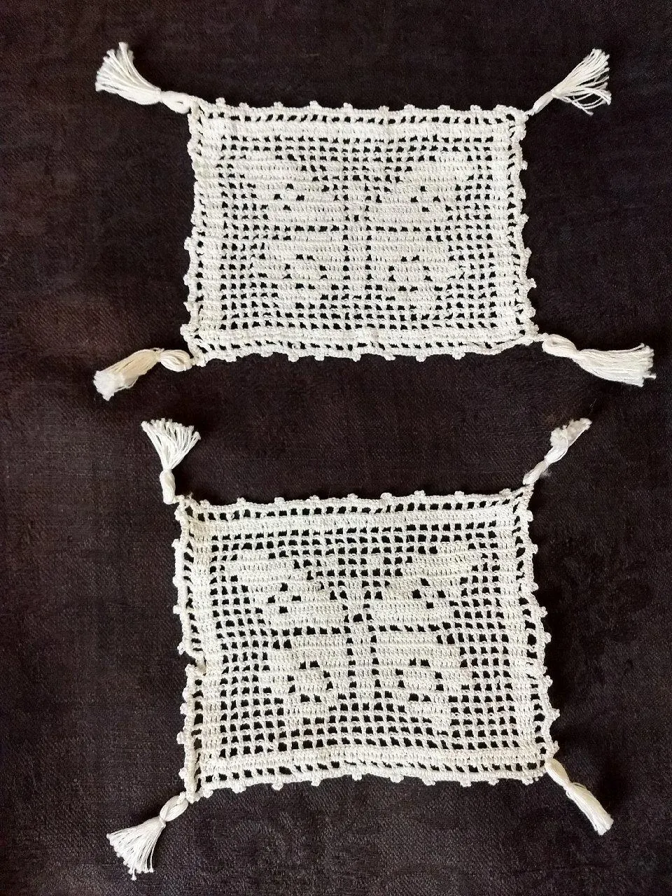 A pair of very sweet hand crochet filet tidy doily with butterfly motif. The rectangle doily tidy, in the early years of the 1900’s, would have been perfect on a dresser or vanity to collect an array of ladies small items, such as a pin cube, pin tray or perhaps a button hook.
