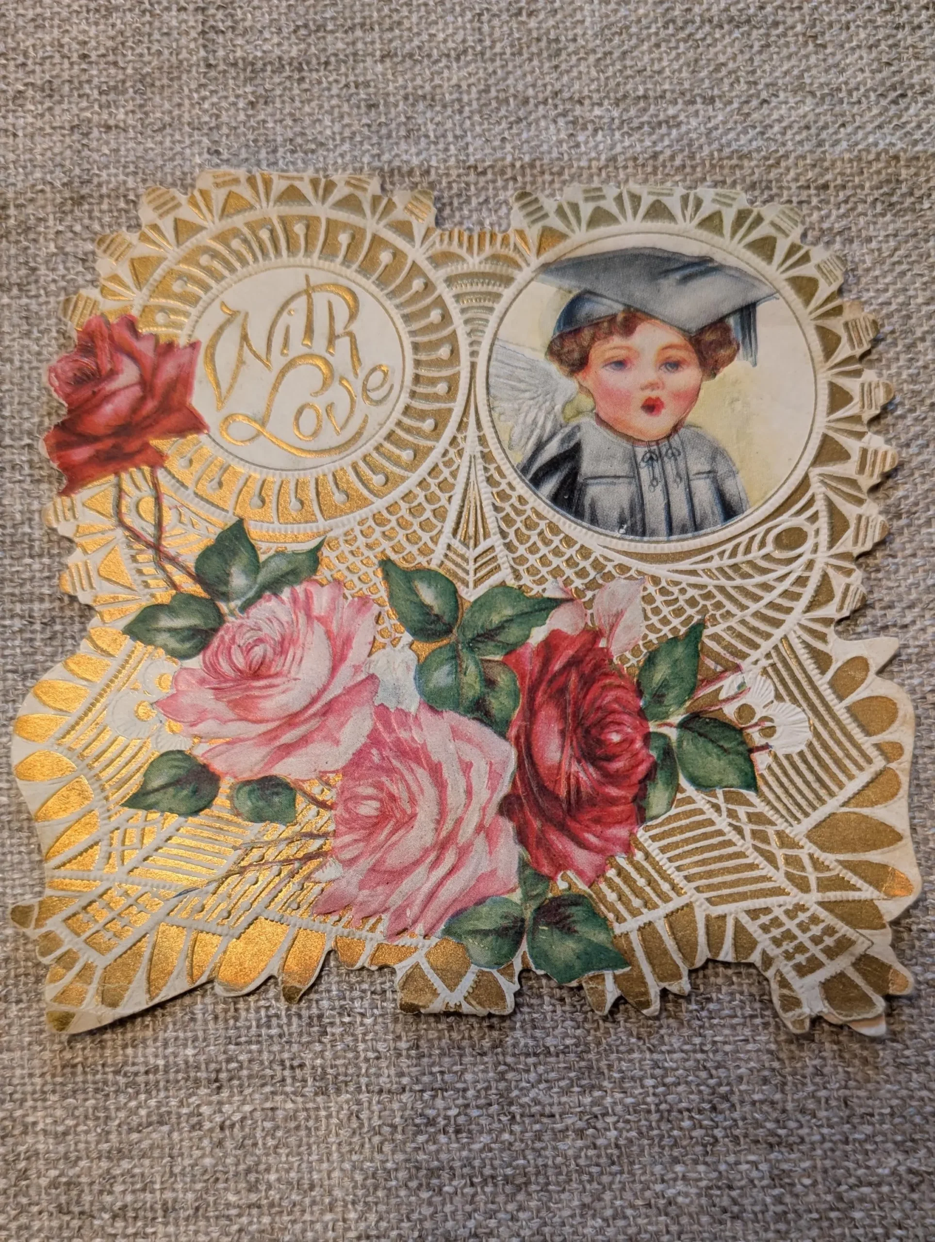 With Love….A vintage valentine printed with roses and a sweet scholar child. The valentine has a decorative cutout edge and lifts to reveal a message. Dating from about the 1910’s, the size of the valentine is 4-1/2″ square. Condition is quite good considering the decorative edging. A few slight bends which would be very common.