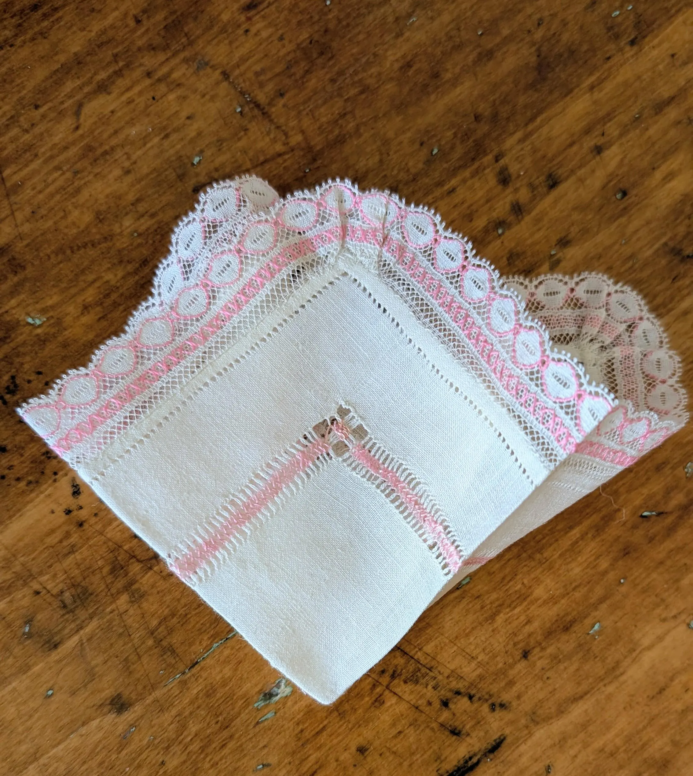 The handkerchief is worked in a square design of drawn thread embroidery accented with pink threadwork. Fine hemstitching adds a tasteful detail, while the lace edging provides a soft, elegant finish. Smaller in scale, it was just the right size to peek neatly from a dress pocket, a fashionable and graceful touch of the 1920s, 1930’s and 1940’s.