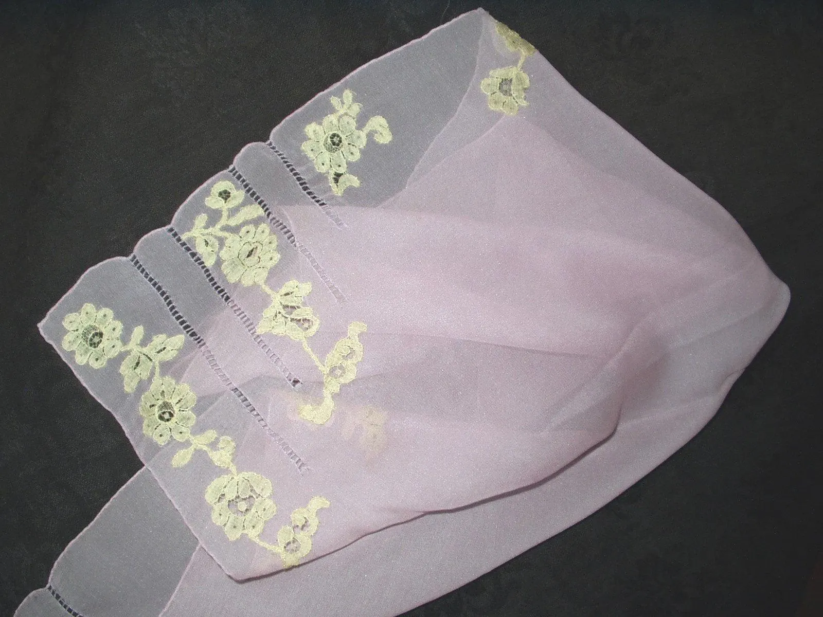 A vintage late 1920’s or 1930’s silk chiffon handkerchief scarf in a pretty shade of lavender, One corner of the scarf is filled with lace appliques in a cream color. A series of drawn thread, worked in different lengths, accents the lace appliques.