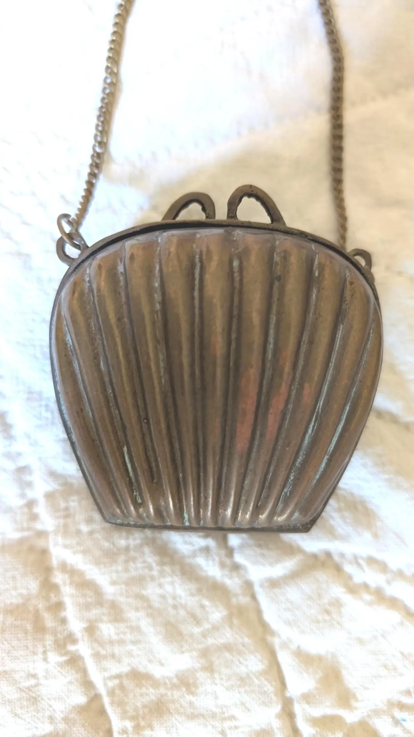 A charming little survivor of the Jazz Age, this ribbed brass clamshell coin purse carries all the romance of early Art Deco design—complete with its original wrist chain and a wonderfully plush black velvet interior. A petite treasure perfect for collectors, display, or period-style accessorizing.
