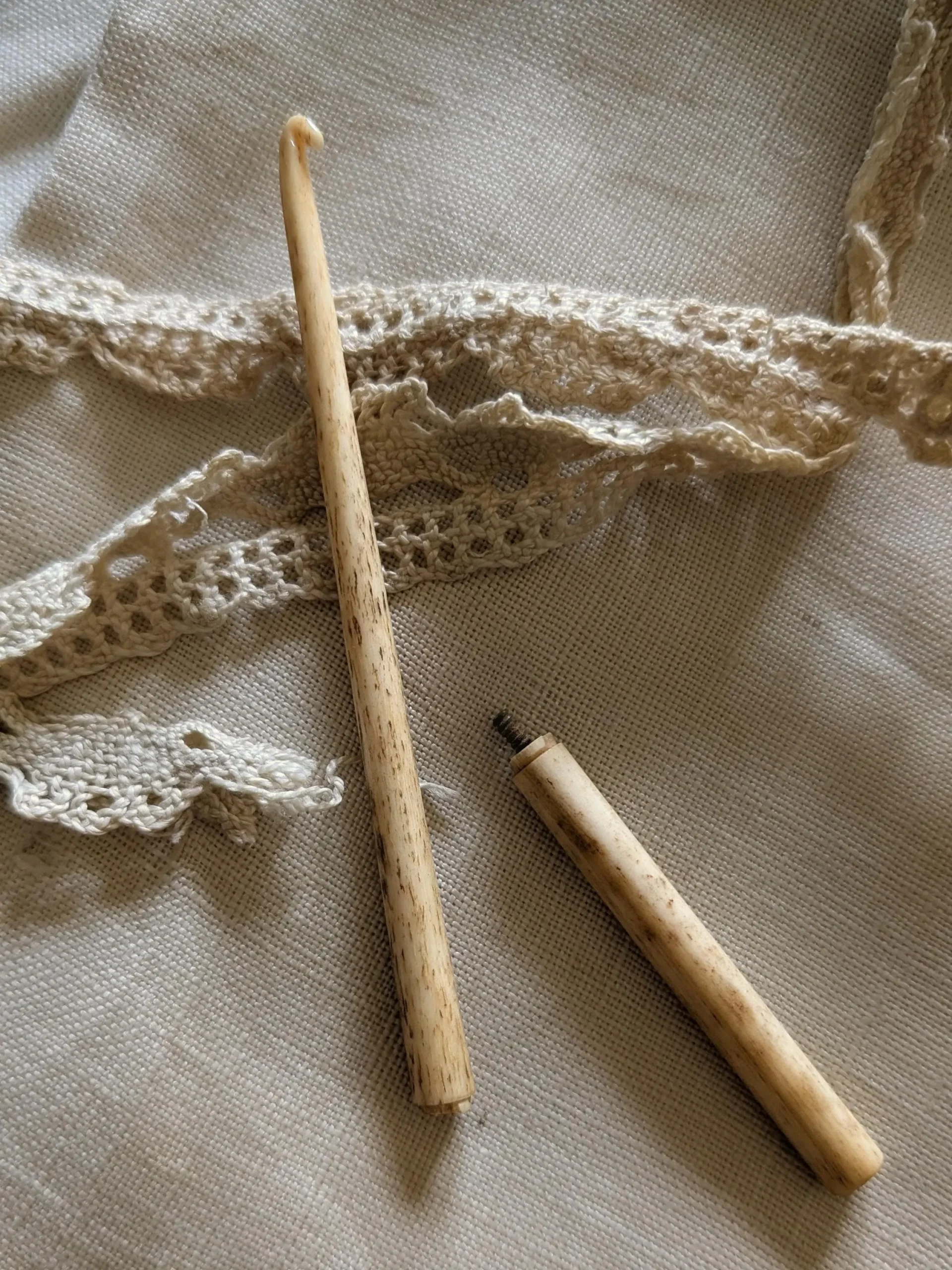A dandy old bone crochet needlework tool from the vintage years of 1930’s – 1950’s. This tool is threaded allowing the upper and lower portions to separate. Some slight wear around this point but very minor. Very nice markings of the bone through the entire hook.