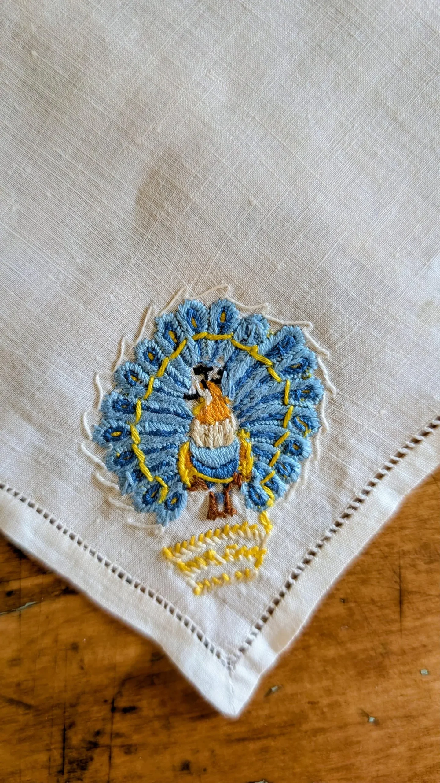 This single vintage cocktail napkin is a lovely example of hand-embroidered Madeira work, dating from the 1940s to 1950s. Worked on fine, natural linen, the design features a bright peacock rendered in shades of blue, gold, and soft brown, stitched entirely by hand in satin and outline embroidery. The napkin is neatly hemstitched along the border—a traditional finish associated with Madeira linens.