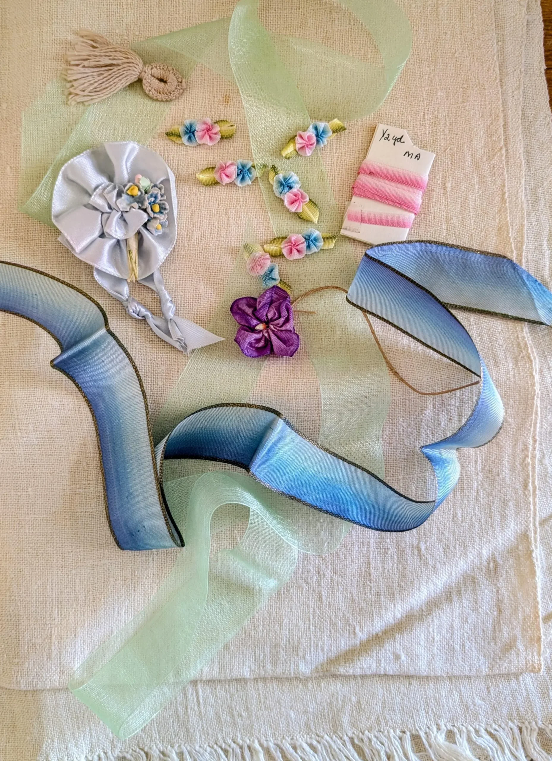 From soft ombré silks to sheer airy ribbon and finely gathered rosettes, each piece carries the quiet elegance of earlier sewing traditions—ideal for embellishing doll clothing, heirloom garments, handmade journals, or millinery work.