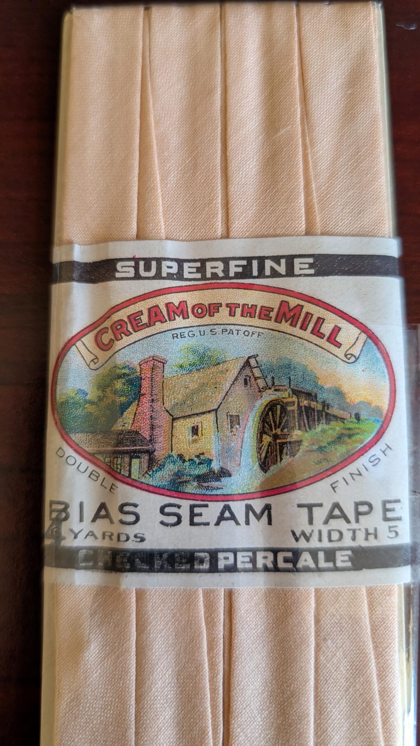 Are you interested in research of vintage sewing notions? The label of this old bias seam binding is dated 1922. Still in the original wrapper of cellophane, the graphic label is Cream Of The Mill. Possibly a Corticelli brand name, the label features an old pioneer mill with water wheel. Four yards of double finish seam tape. Superfine percale in a peach color.