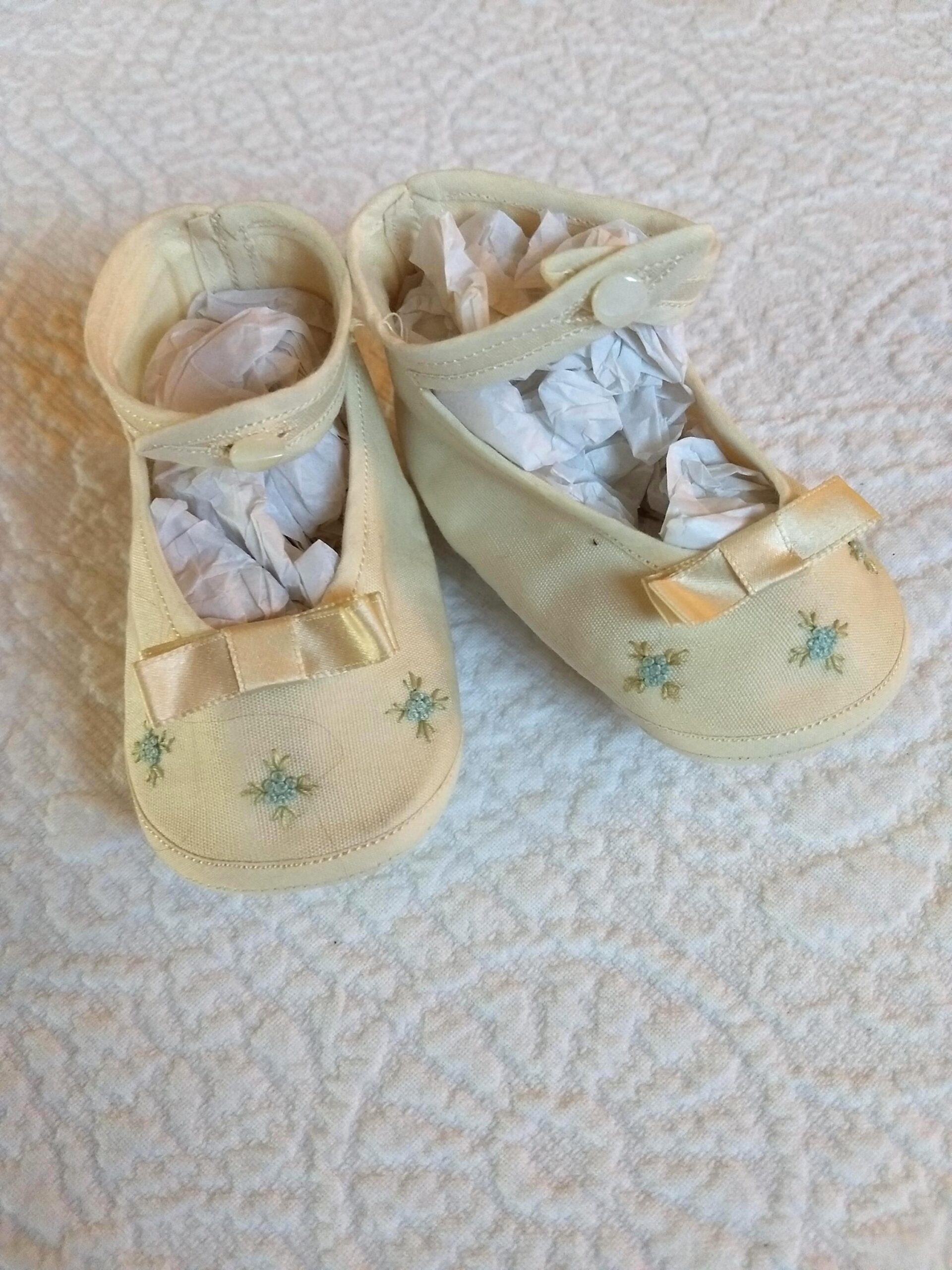 A sweet pair of baby shoes that have never worn. Dating from the 1930’s, the slippers are made of faille fabric. Possibly a rayon. Decorated across the toe with three dainty embroidered flowers with an added embellished of a ribbon bow.