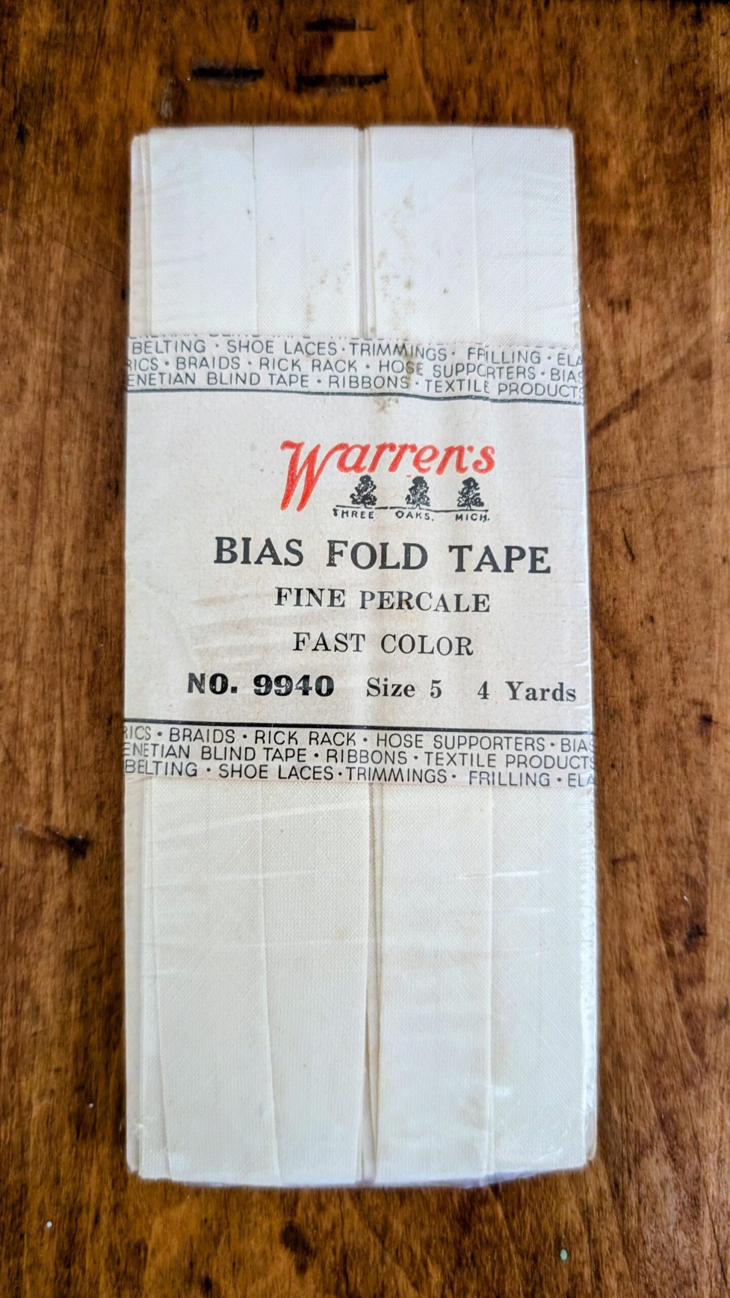 A vintage Warren bias fold tape. Fine Percale. White in Color. No. 9940, Size 5, 4 Yards, Sewing Trim Notion